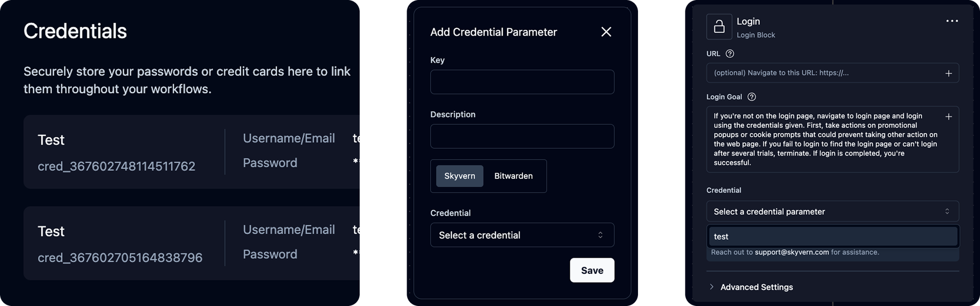 With this release, you can now add, save, and link credentials into your workflow without leaving Skyvern. Three easy steps: add credential, add a credential parameter in workflow, and link!