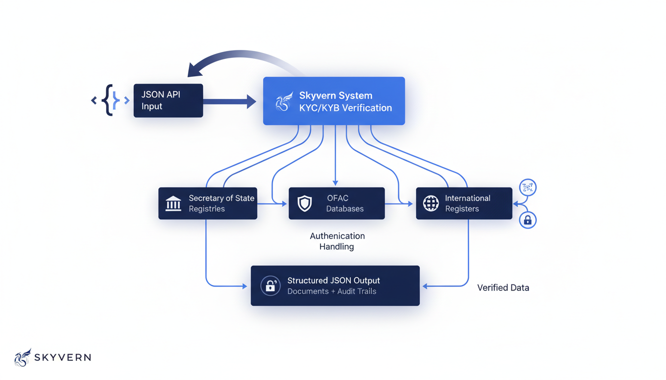 Government KYC and KYB verification pulls from multiple official databases that don't communicate with each other. Each requires its own search interface, login flow, and data format.