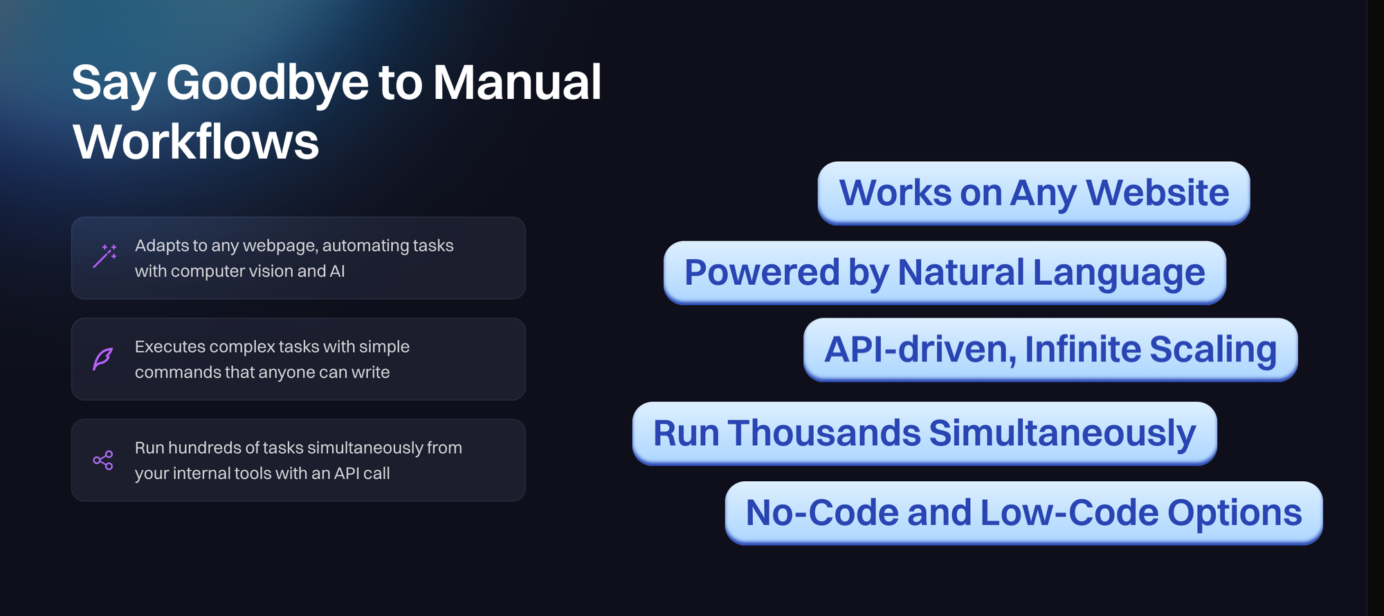 This approach makes browser automation accessible to a much broader audience than traditional solutions like Selenium or Playwright.