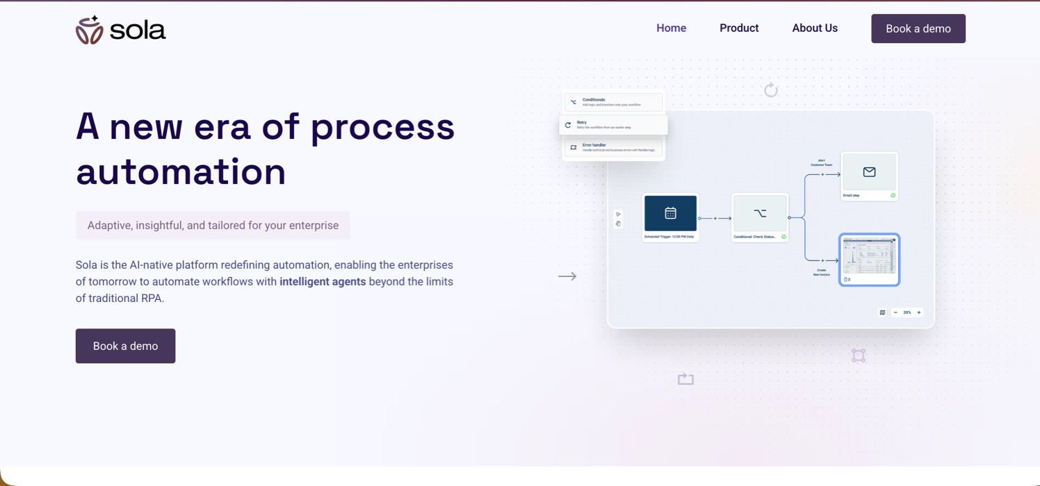 Sola is an AI-native workflow automation tool that converts screen recordings into executable bots using LLMs and computer vision. It targets teams in legal, finance, insurance, and healthcare with repetitive data entry, document processing, and filing workflows who want AI-assisted automation without writing code from scratch.