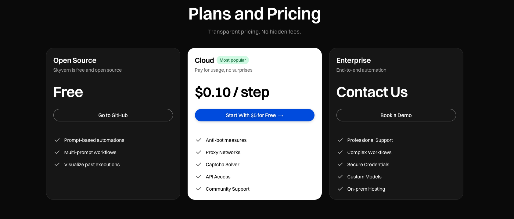 Skyvern also plays nice with your budget. They start with a free, open-source version, or a cloud plan that charges just $0.10 per step and explicitly promises "no surprises"