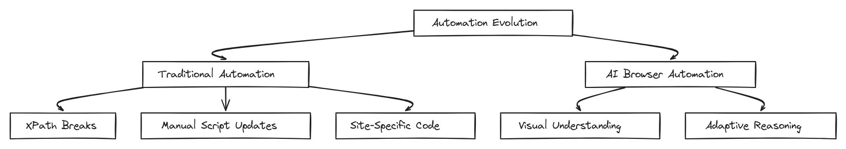 - Traditional automation tools break when websites change layouts, requiring constant script maintenance and custom code for each site