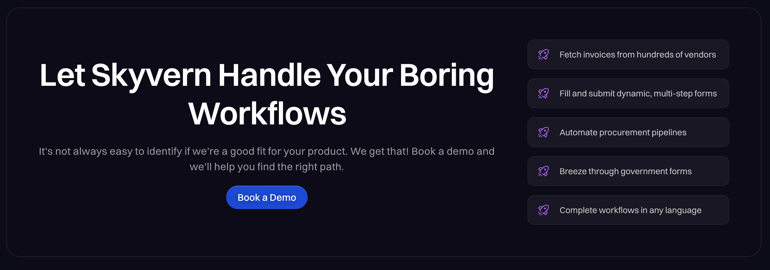 Skyvern can operate on websites it's never seen before, mapping visual elements to actions necessary to complete workflows without customized code. This means you can start with one vendor and easily expand to others without writing new code for each site.