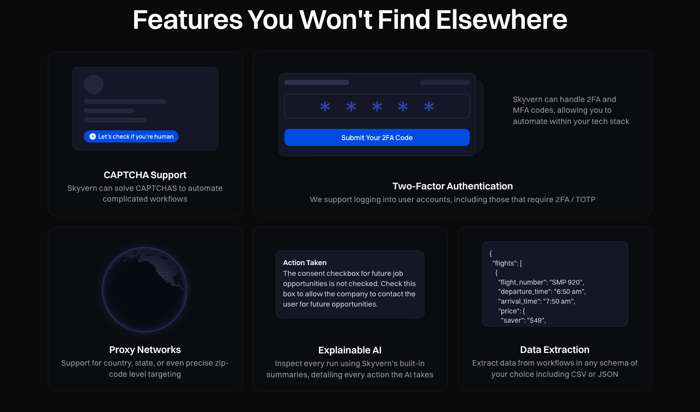 - Skyvern eliminates months of custom development by providing ready-to-use AI form detection and submission features