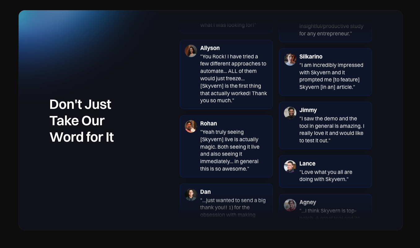 Skyvern helps companies achieve these gains through browser-based workflow automation that eliminates the bottlenecks of manual processes while maintaining the flexibility to adapt to changing business requirements.