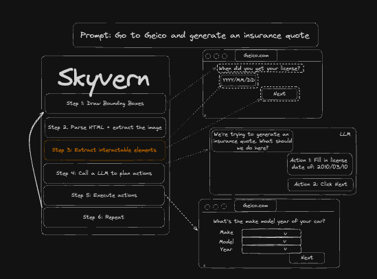 Skyvern identifies and annotates elements on the screen and generates metadata about the interactable elements. It sends both the an annotated screenshot + metadata about the interactable elements to a multi-modal LLM (such as GPT-4O or Claude 3.5 Sonnet) to decide what actions to take to accomplish a users’ goal.