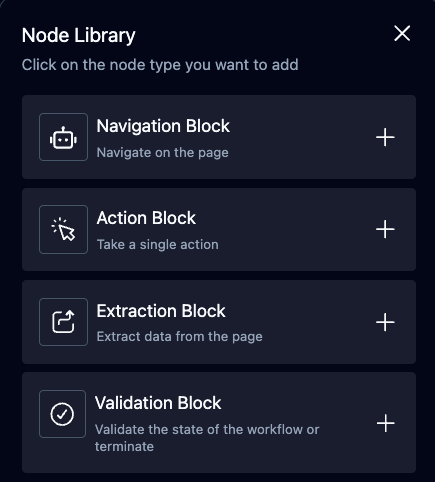 Don't want Skyvern to accept a goal? Use Action block to give it a single action to take on a page. Click a button. Fill in some text. Select an option. Upload a file. It's perfect for when you need a little bit of granular control