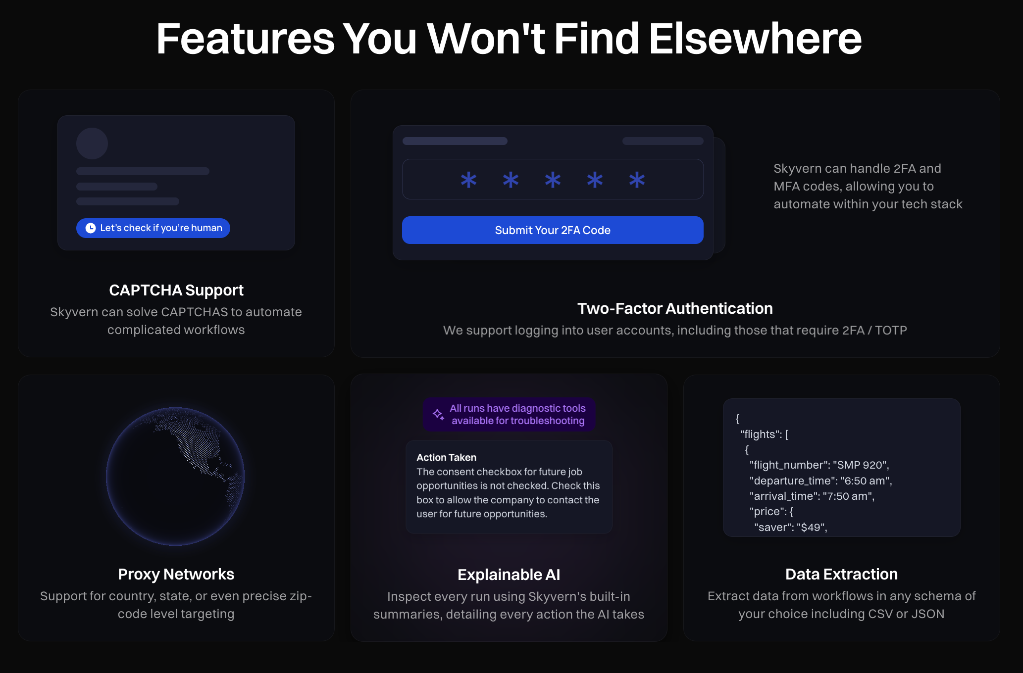 The AI reasoning features are particularly powerful. Skyvern can infer answers to eligibility questions, understand product equivalents across different sites, and handle conditional logic that would require extensive custom programming with traditional tools.
