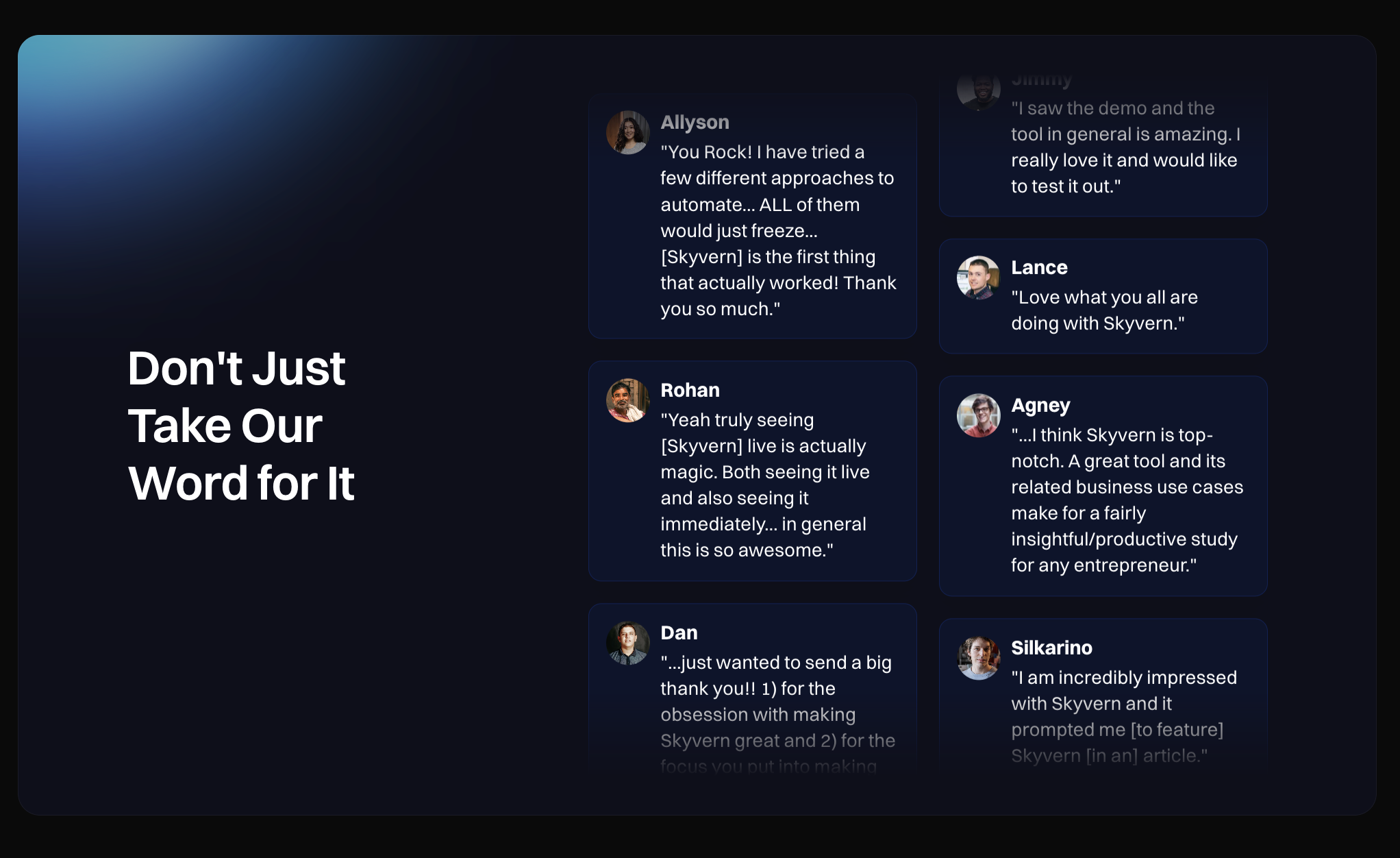 Because the output is structured and validated, your downstream analytics, reporting, or machine learning pipelines can trust the data without additional cleanup. This reliability is what makes it suitable for production workflows. Integration features extend to popular data processing tools, making it easy to add Skyvern into existing analytics workflows.