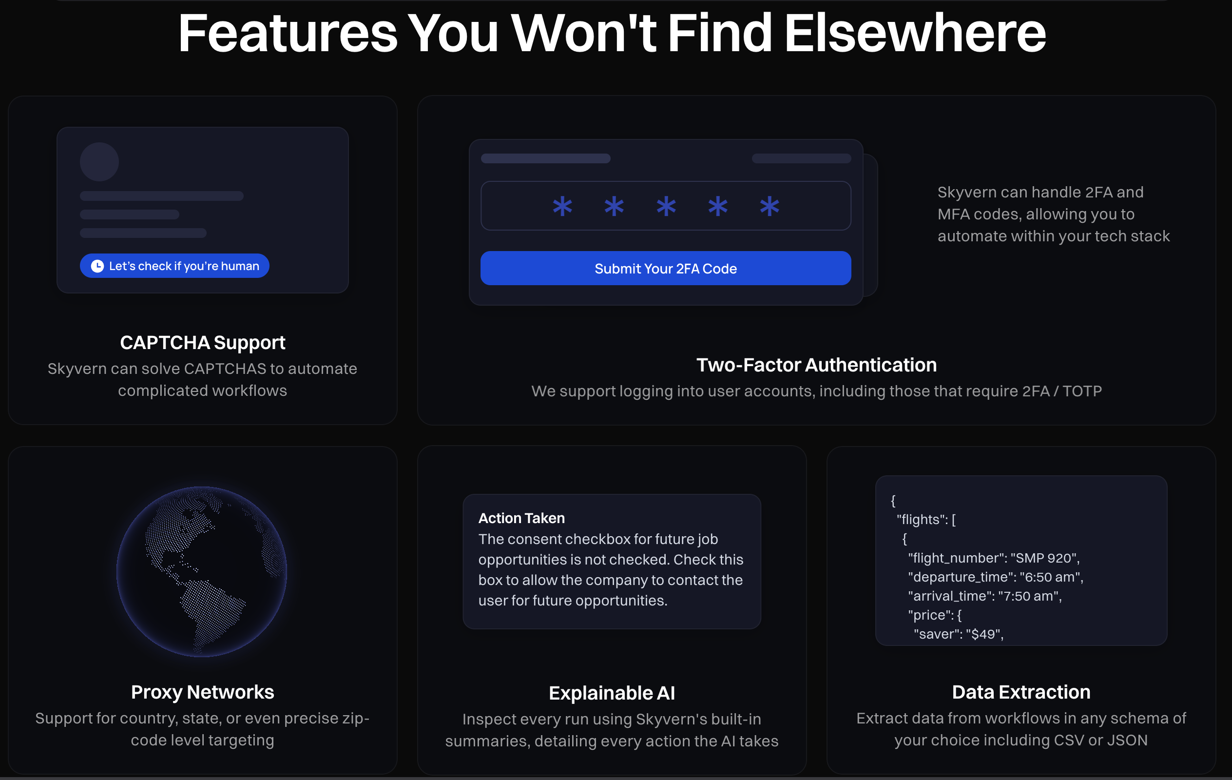Each solution targets different use cases, but most still focus on basic data extraction rather than complete workflow automation. The open source nature of Skyvern provides transparency and customization options that proprietary APIs can't match.