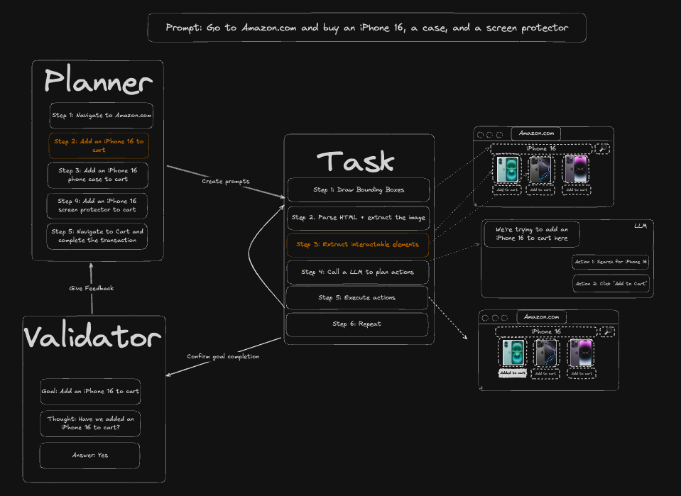 We just released Skyvern 2.0, which can take a single prompt such as "Navigate to Amazon.com and add an iPhone 16, a phone case, and a screen protector to cart", load Amazon.com and carry out the instruction on your behalf.