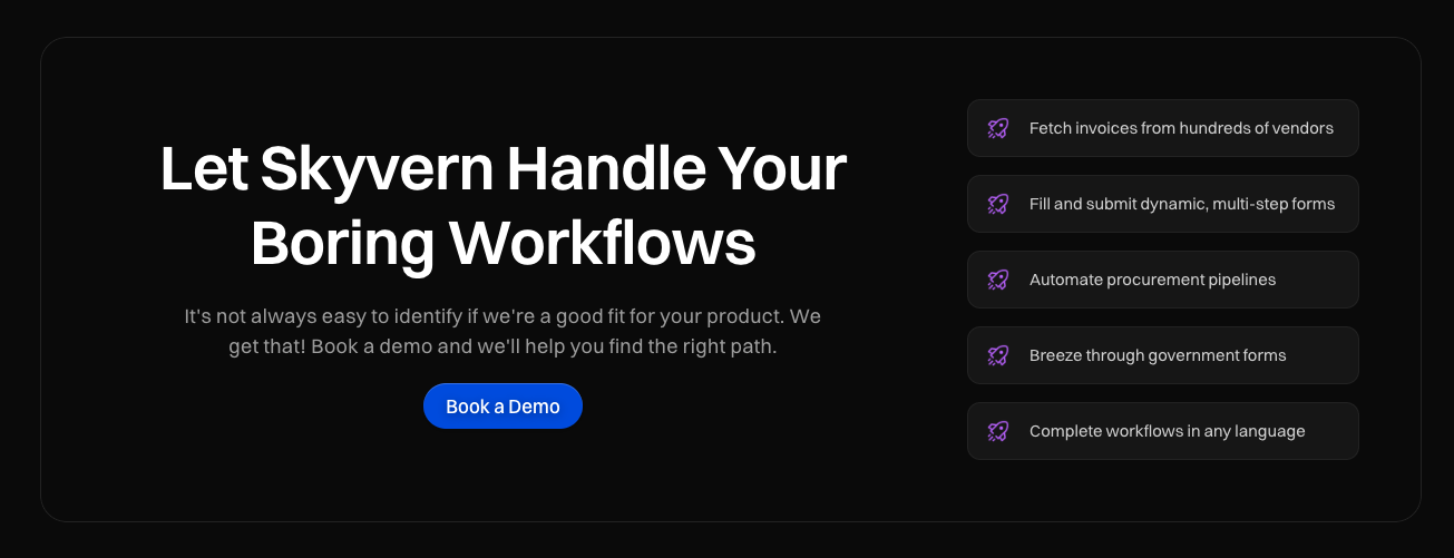 For businesses dealing with websites that lack APIs, Skyvern provides a solution by creating API-like interfaces through intelligent browser automation. Instead of waiting for third-party websites to build APIs, organizations can immediately start programmatically accessing any website's functionality.