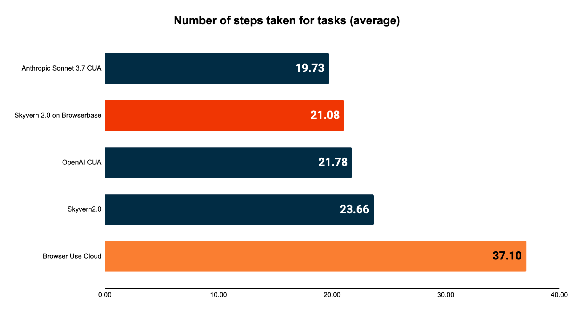 While the right pricing model for browser agents hasn’t emerged yet, this data gives an important insight into whether pricing per hour (common amongst hosted browsers + older robotic process automation) and pricing per step (common amongst computer use APIs) is the right methodology.