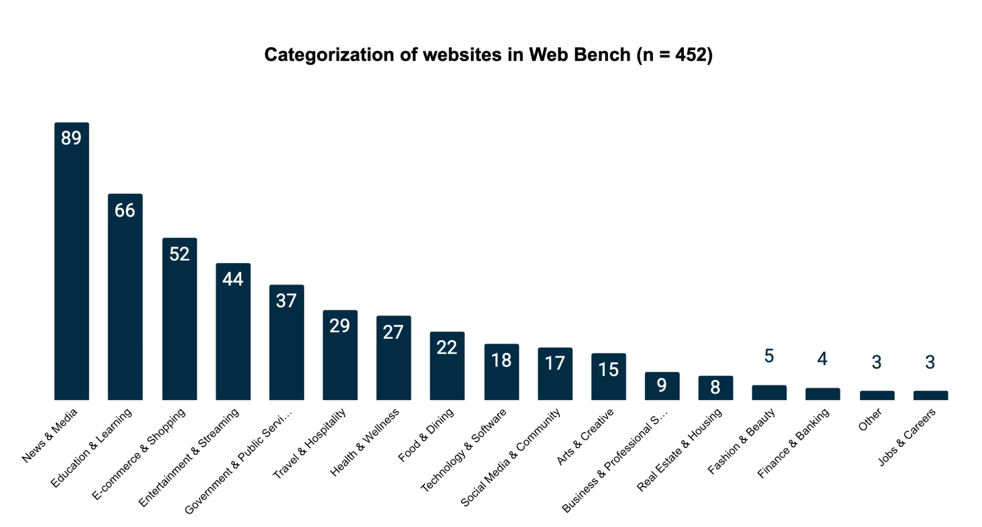 The 452 websites are distributed across 17 primary categories. We sampled the benchmark websites from the top 1000 websites in the world measured by web traffic. We then cleaned this dataset of sites by removing:
