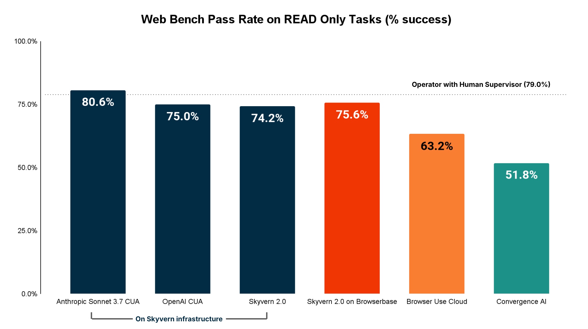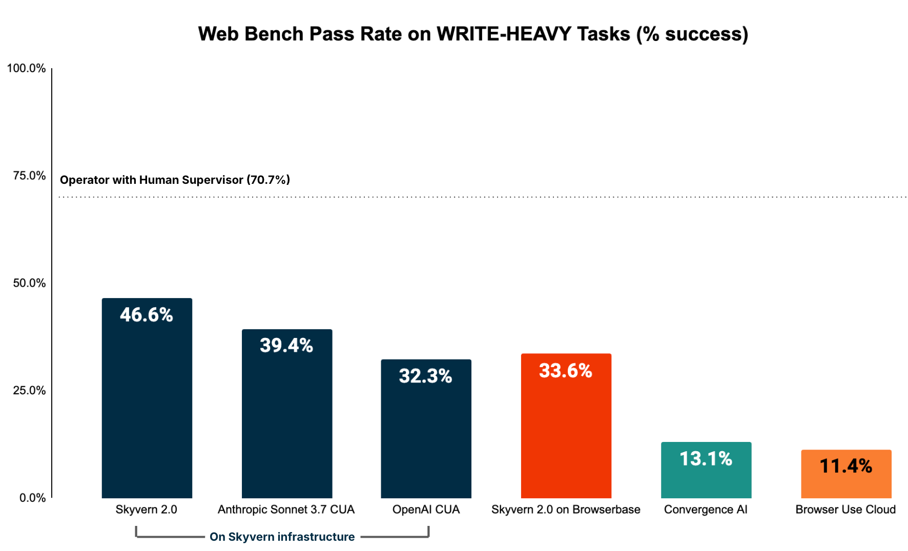 - We also ran Skyvern 2.0 on Browserbase to compare the impact of infrastructure, but found (surprisingly) that Skyvern’s infrastructure was able to reliably access more websites and encountered less anti-bot issues during navigation