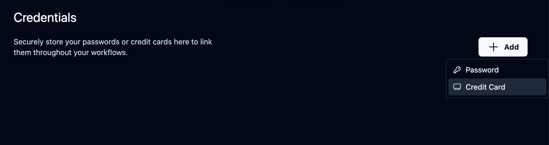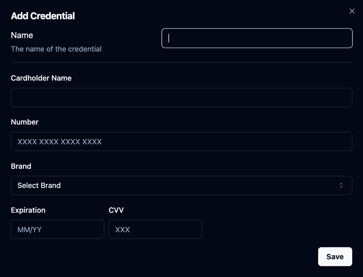 Like passwords, credit cards are managed on the Skyvern Credentials page.