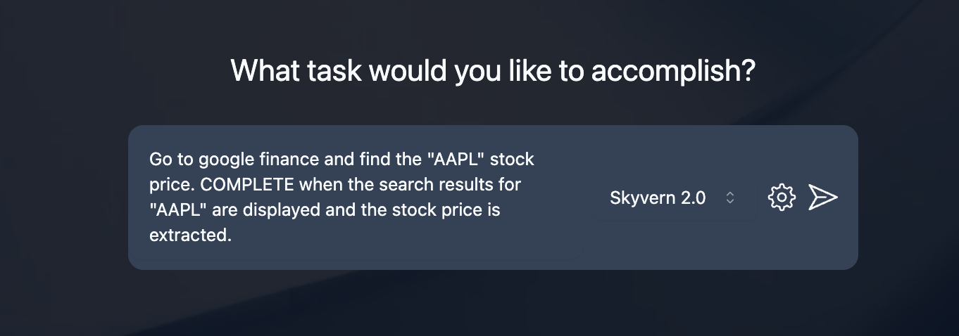 Ask the Skyvern agent to run a task and see it in action! Here are some examples you can try: