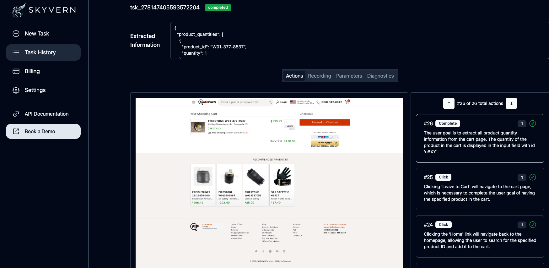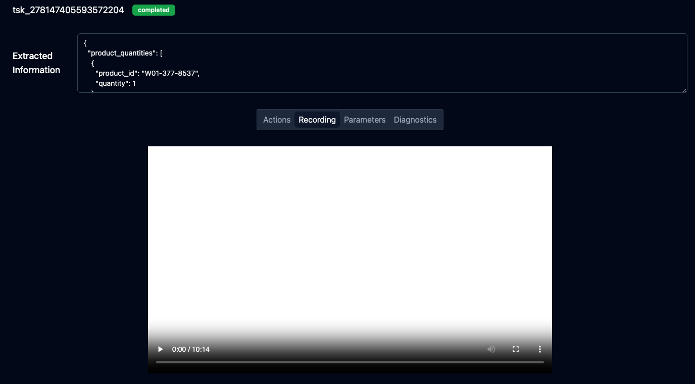 Each Skyvern task comes with a recording of the entire operation (end to end). To view the recording, click on the recording tab.