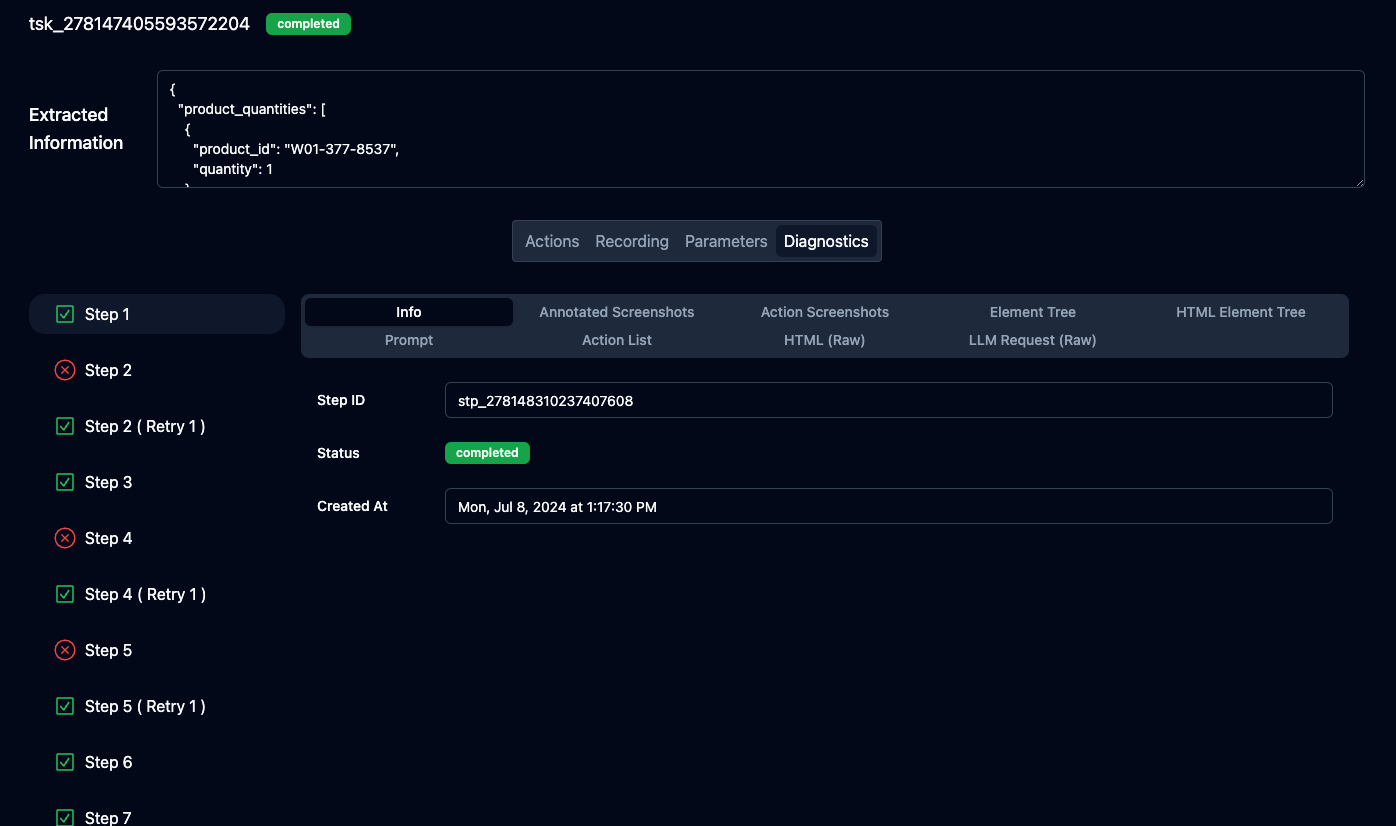 The diagnostics tab contains information used by Skyvern to do its processing. It includes information such as the annotated screenshots, action screenshots, element tree, prompt, action list, page HTML, and the raw LLM Request.