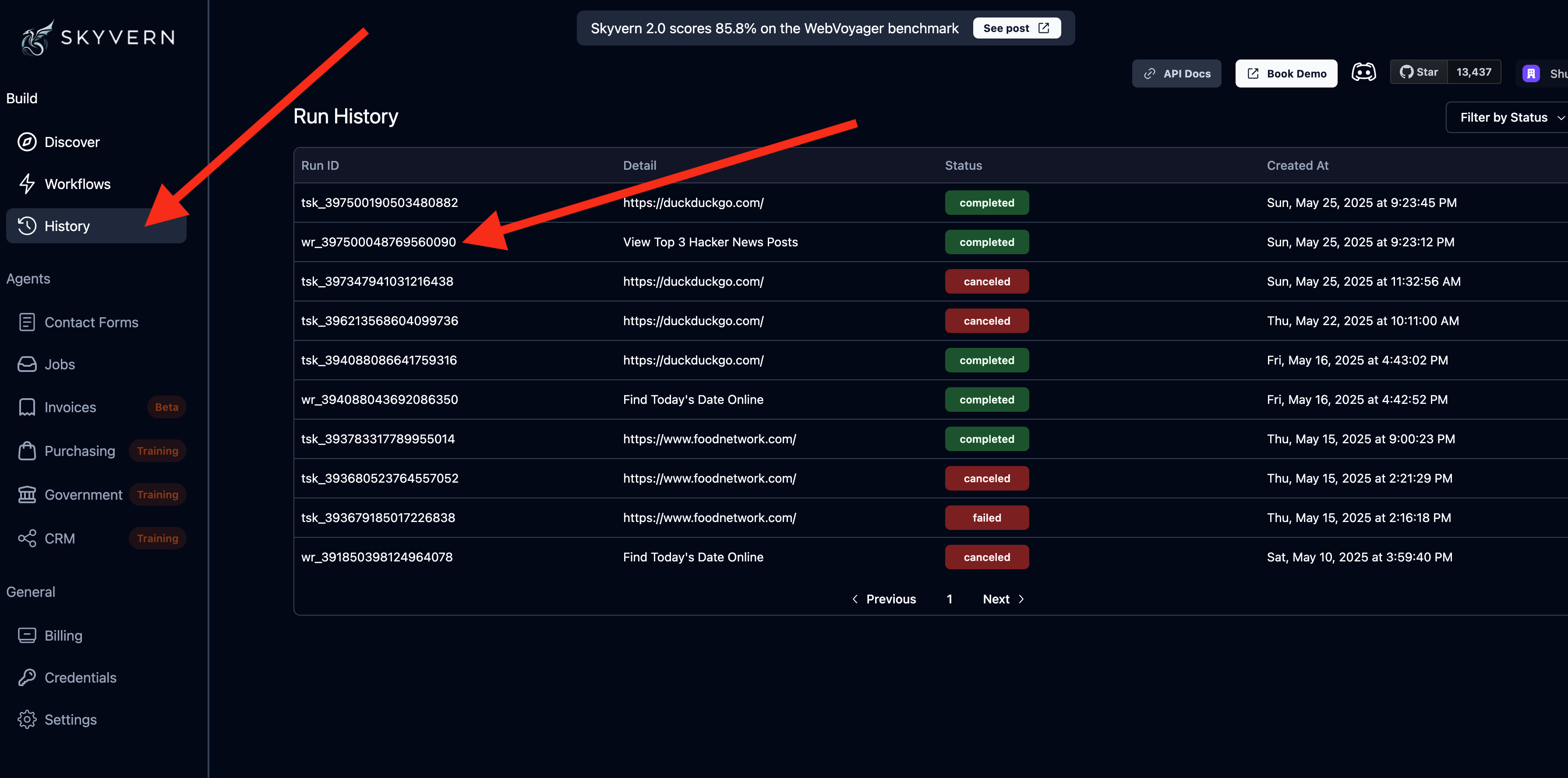 Skyvern comes bundled with a Visualizer to help you understand what’s going on with your tasks. To get started, navigate to the history page and click on any agent run.